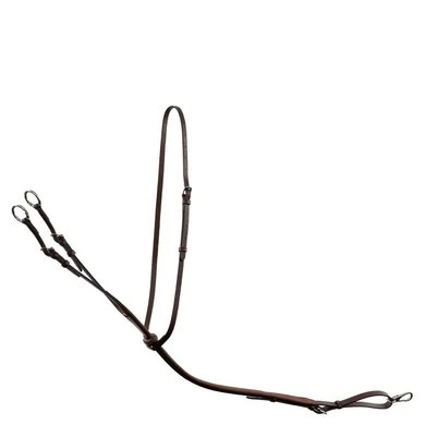 Lederen martingaal met verzilverde messing gespen. De martingaal, meestal gebruikt bij het springen, voorkomt dat het paard het hoofd omhoog kan gooien. Bovendien zorgt de martingaal voor een hoek in de teugels als het paard het hoofd toch omhoog brengt, waardoor het bit neerwaarts kan inwerken op de lagen en niet op de minder gevoelige mondhoeken. De martingaal is zacht gevoerd voor extra comfort, daarnaast zijn de teugelringen voorzien van speciale clips. Deze ronde clips openen naar binnen en maken het makkelijker om teugels vast of los te maken zonder gevaar dat de teugels op ongewenste momenten los kunnen komen. Gemaakt van Europees leder. Met rubberen martingaalstopper.