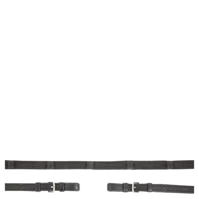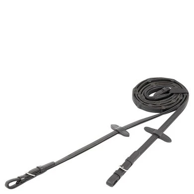 BR lederen teugel Deze lederen teugel bevat chromen gespen en negen bedekte stops. De teugel is aan een zijde bedekt met antislipmateriaal. Het bijzondere aan deze teugel is dat de stops in het leder verwerkt zijn. Breedte: 16 mm.