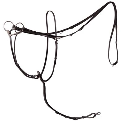 Lederen Thiedemann teugel met een verstelbare halsriem en een verstelbare singellus met een afneembare karabijnhaak voor bevestiging aan de singel. De smalle riemen van de martingaal zijn eveneens verstelbaar en voorzien van karabijnhaken. De rubberen teugel (21 mm breed) heeft lederen uiteinden (15 mm breed) met gespsluitingen. Deze teugel is aan beide zijden voorzien van drie D-ringen: twee op het lederen uiteinden en één op het rubberen gedeelte. De smalle martingaalriemen worden door de bitringen gehaald en met de karabijnhaken aan de D-ringen van de teugel bevestigd. De Thiedemann teugel is uitgerust met glanzende, zilverkleurige fournituren van verchroomd messing. De Thiedemann teugel zorgt ervoor dat het paard het hoofd niet te ver omhoog en/of naar voren kan brengen tijdens het rijden.