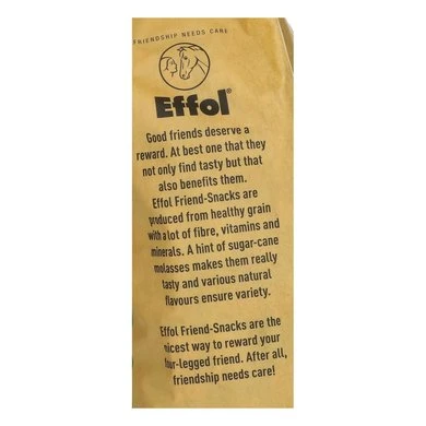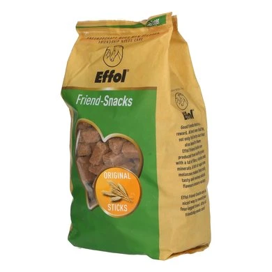 Effol Friend-Snacks Original Sticks worden gemaakt van gezonde granen boordevol vezels, vitaminen en mineralen. Een snufje suikerrietmelasse zorgt voor een zoete smaak. De Effol Friend-Snacks zijn bijzonder geschikt als tussendoortje of als beloning voor paard of pony. Inhoud: 1 kg + 10% extra.