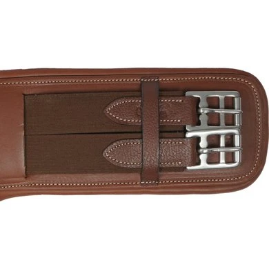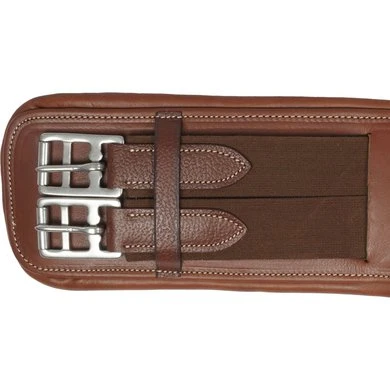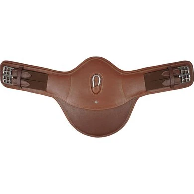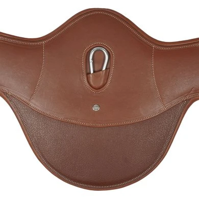 Korte rundleder singel met buikflap opgevuld met 4 mm EVA-schuim. Buikflap is versterkt met generfd buffelleer. Contrasterende stiksels. Rolgespen op elastische banden. Centrale ring voor trainingshulpmiddelen. Roestvrij stalen gespen.
