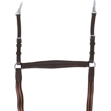 Lederen voortuig met RVS fournituren met elastische en afneembare martingaalvorkjes.