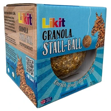 Smakelijke granola stalbal met pepermuntsmaak en een lus om de bal met een touw op te hangen (touw niet inbegrepen). Door deze Likit Granola bal voorkom je verveling in de stal en heeft je paard of pony altijd wat te spelen. Ze bevatten onder andere maïs, graan, gerst en havervlokken