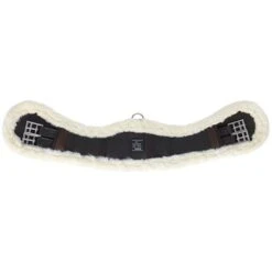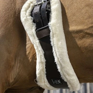 Korte synthetische singel van leerachtig polyurethaan gevoerd met synthetisch schapenvacht met hoge dichtheid. Rolgespen aan dubbele elastische uiteinden. Beschikt over een centrale ring.