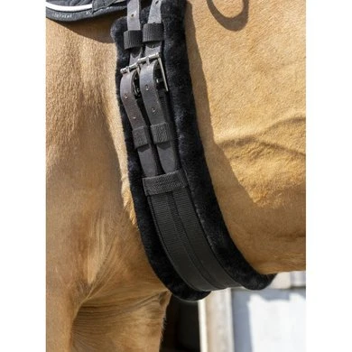 Synthetische schapenvacht gevoerde polypropyleen singel. Roestvrij stalen rolgespen. Dubbele elastische riemen aan één uiteinde.
