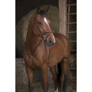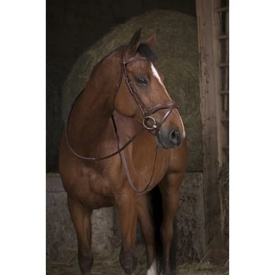 Rubber teugels met grote noppen van 19-mm breed met leren uiteinden met blinde sluiting. Roestvrijstalen gespen.