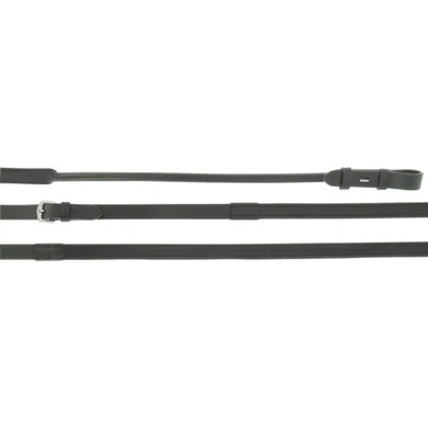 Hunter teugels van buffelleer, 16 mm met blinde sluiting. Eerste gedeelte van de teugels is rondgenaaid leer. Zwarte stiksels. Roestvrij stalen gespen..