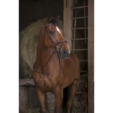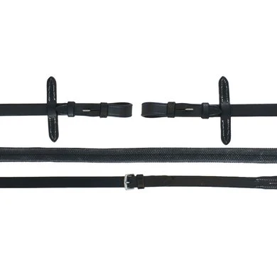 Rubber teugels met leren uiteinden met blinde sluiting. 3,5 mm dik propyleen. Witte stiksels. Roestvrijstalen gespen.