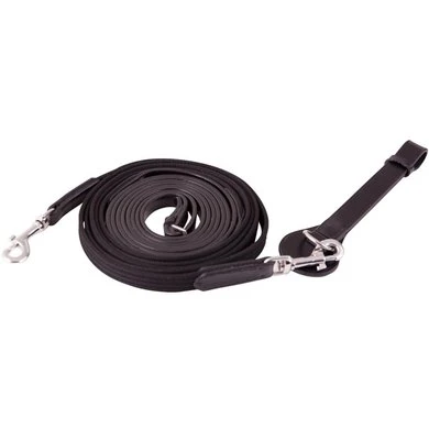Linnen slofteugel, 19 mm, met glad lederen teugelgedeelten, 16 mm. De slofteugel is voorzien van twee musketons en een afneembare lederen singellus met D-ring. De slofteugel is voorzien van roestvrijstalen fournituren. Het doel van de slofteugel is een juiste hoofdhouding van het paard. Als het paard het hoofd te hoog houdt zal de slofteugel inwerken en druk geven op het bit, als het paard nageeft zal de druk afnemen.