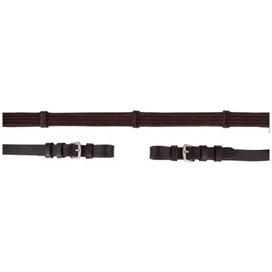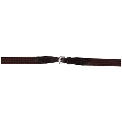 Linnen jachtteugel met dubbele handlussen voor meer houvast. De teugel heeft lederen hand- en teugelstops, 19 mm breed. De lederen uiteinden met roestvrijstalen gespsluitingen zijn 16 mm breed.