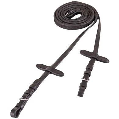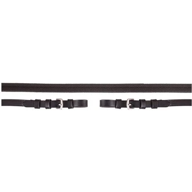Rubberen grip teugel versterkt met nylon en voorzien van lederen teugelstops, 13 mm breed. De lederen uiteinden met roestvrijstalen gespsluitingen zijn ook 13 mm breed.