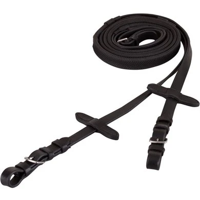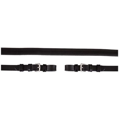 Rubberen grip teugel versterkt met nylon en voorzien van lederen teugelstops, 16 mm breed. De lederen uiteinden met roestvrijstalen gespsluitingen zijn ook 16 mm breed.