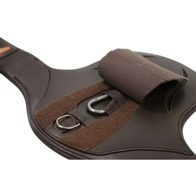 Meer bewegingsvrijheid door optimale drukverdeling: de innovatieve “Comfort Zone” op de Oklahoma noppenbeschermingsgordel van Schockemöhle Sports zet nieuwe maatstaven. Anatomisch gevormd, de singel is bijzonder vlak bij de ellebogen. Tegelijkertijd zorgt de bredere middenplaat met meerlaags zachtschuim voor een nog betere drukverdeling op de borst. Het bestaat uit steviger leer en beschermt dus ook tegen stoten. De grote karabijnhaak maakt het voor de berijder gemakkelijker om het borsttuig vast te maken. Eenmaal vastgemaakt voorkomt de hoes met de grote lederen flap dat het paard bijvoorbeeld gevaarlijk in een borsttuig stapt. Ook het tweezijdige drielaagse elastiek en de zacht gevoerde rolgespen tillen het comfort voor het paard naar een nieuw niveau.