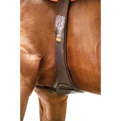Portland is een nieuwe, anatomisch gesneden lange singel van Schockemöhle Sports. Het vlakke deel van de singel ter hoogte van de ellebogen van het paard zorgt voor maximale bewegingsvrijheid. Bovendien verdeelt het bredere, iets stevigere middengedeelte van de riem de druk op de borst nog beter. De Portland lange singel is gemaakt van generfd zacht leer en heeft een grote karabijnhaak in het midden om het borsttuig makkelijker vast te maken. Voor nog meer veiligheid kan de karabijnhaak worden afgedekt met de grote lederen flap. Twee zijdelingse D-ringen bieden nog meer mogelijkheden voor het bevestigen van hulpteugels. De zadelsingel, verkrijgbaar in zwart/zilver en bruin/zilver, is voorzien van drielaags elastiek aan beide zijden en massieve rolgespen met zachte vulling.