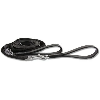 Leren trekteugels met nylon touw in het rond gestikt. Met aan beide uiteinden een leren lus en een karabijnhaak zodat de teugels gemakkelijk kunnen worden losgehaakt.