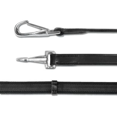 Ingewreven rubber. Met lederen handgrepen en aanslagen.